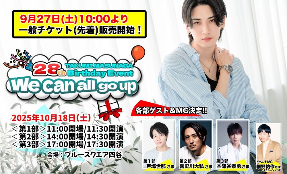 10月18日(土)開催、「益永拓弥 28th Birthday Event 〜we can all go up〜」のチケット一般販売が決定しました。